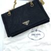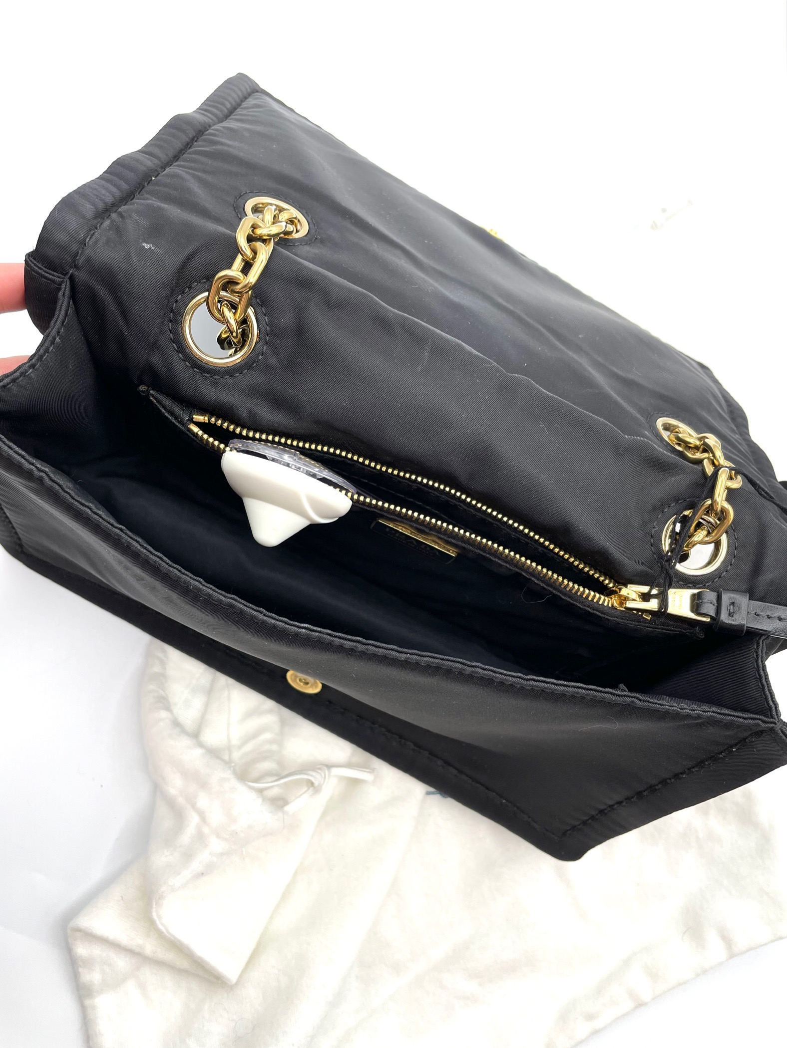 Black nylon “Pattina” crossbody bag. The chain strap can be used cross-body or on the shoulder. Iconic brand logo on the front. Authenticity card and original dustbag included.