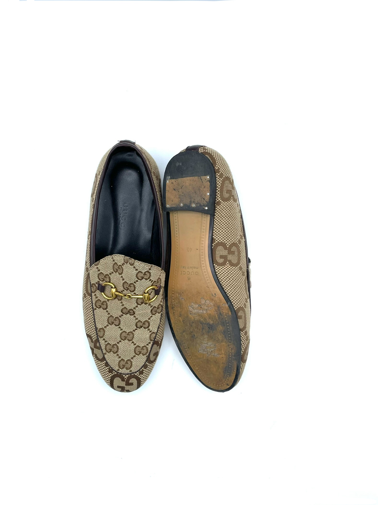 Classic Gucci loafers in GG canvas with leather details. Brown color. Horsebit hardware. Signs of wear see photos.