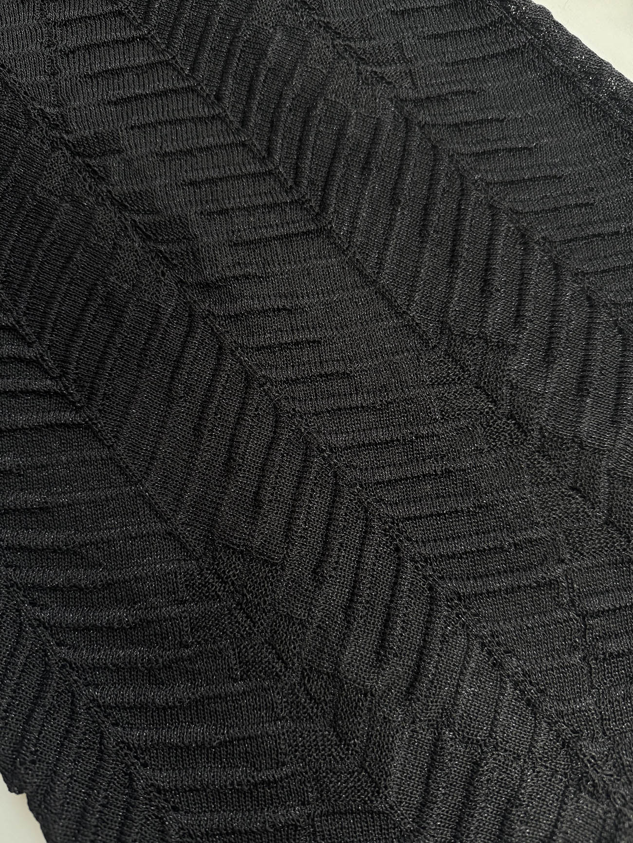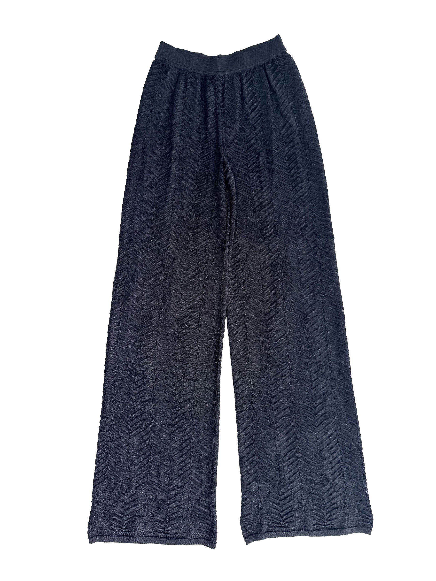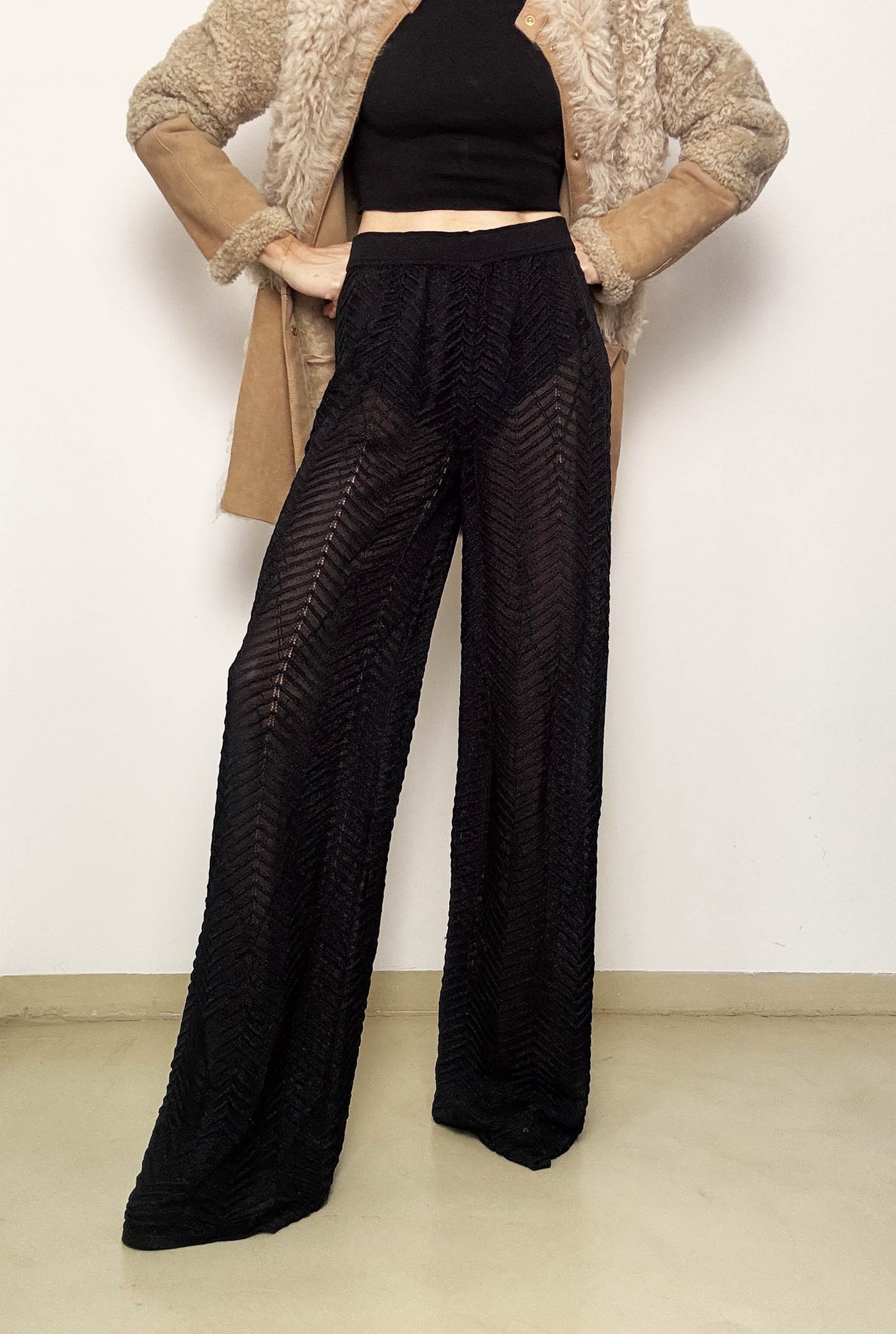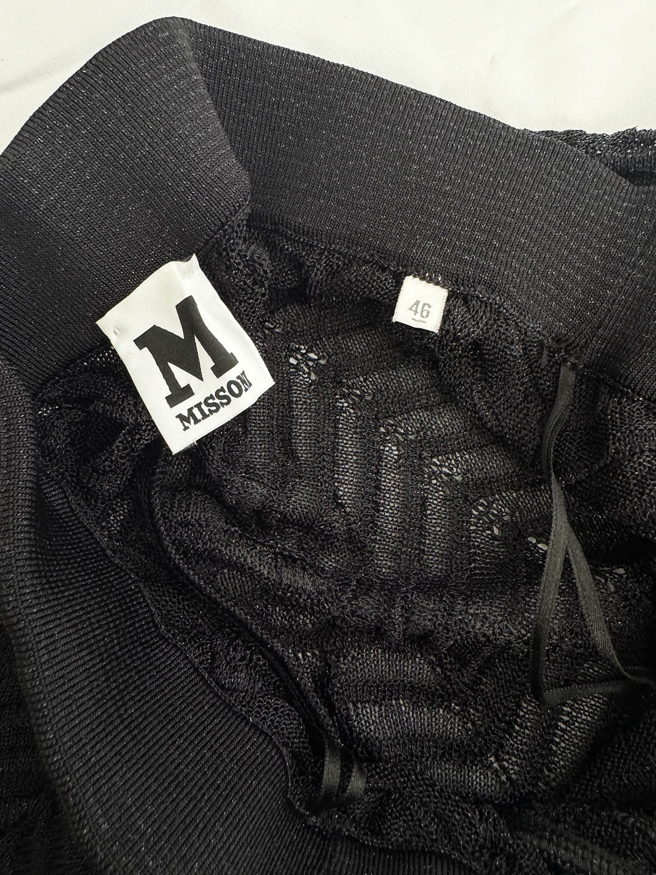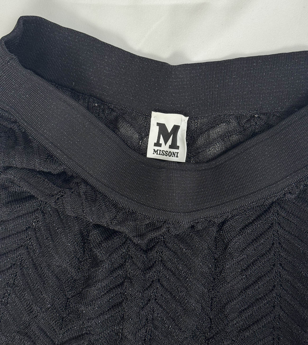 M Missoni knitted trousers,the fabric label has been removed but in our experience it is a viscose and polyester blend fabric as it contains lurex. Balck color, excellent conditions, it has an elastic waist, and the fit is soft and comfortable. It is marked size 46 but fits from M to L. The person wearing it in the photo is a size 42, height 170 cm