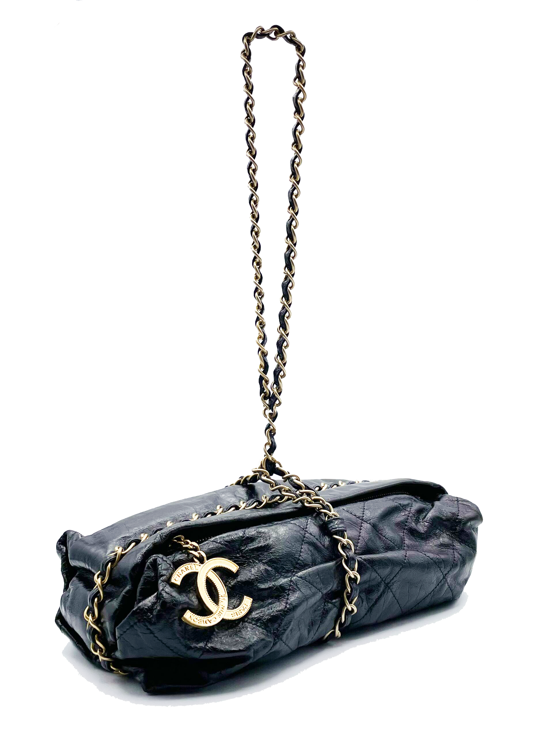This is a unique piece from pre fall 2012 fashion show by Karl Lagerfeld. Handbag or clutch with a chain as a decoration, wrapped like a gift box. Black leather, double zip compartment. As new, never used.