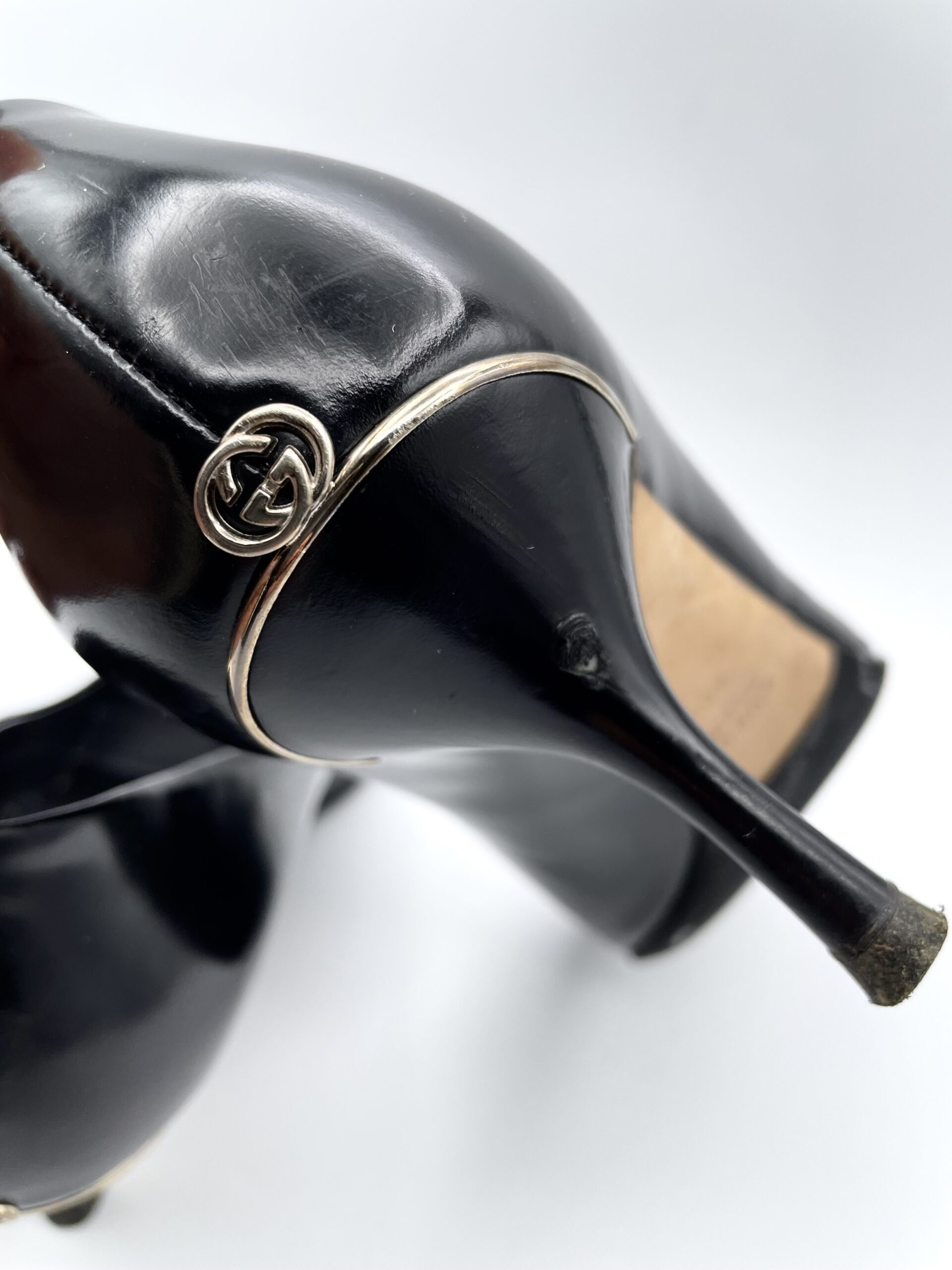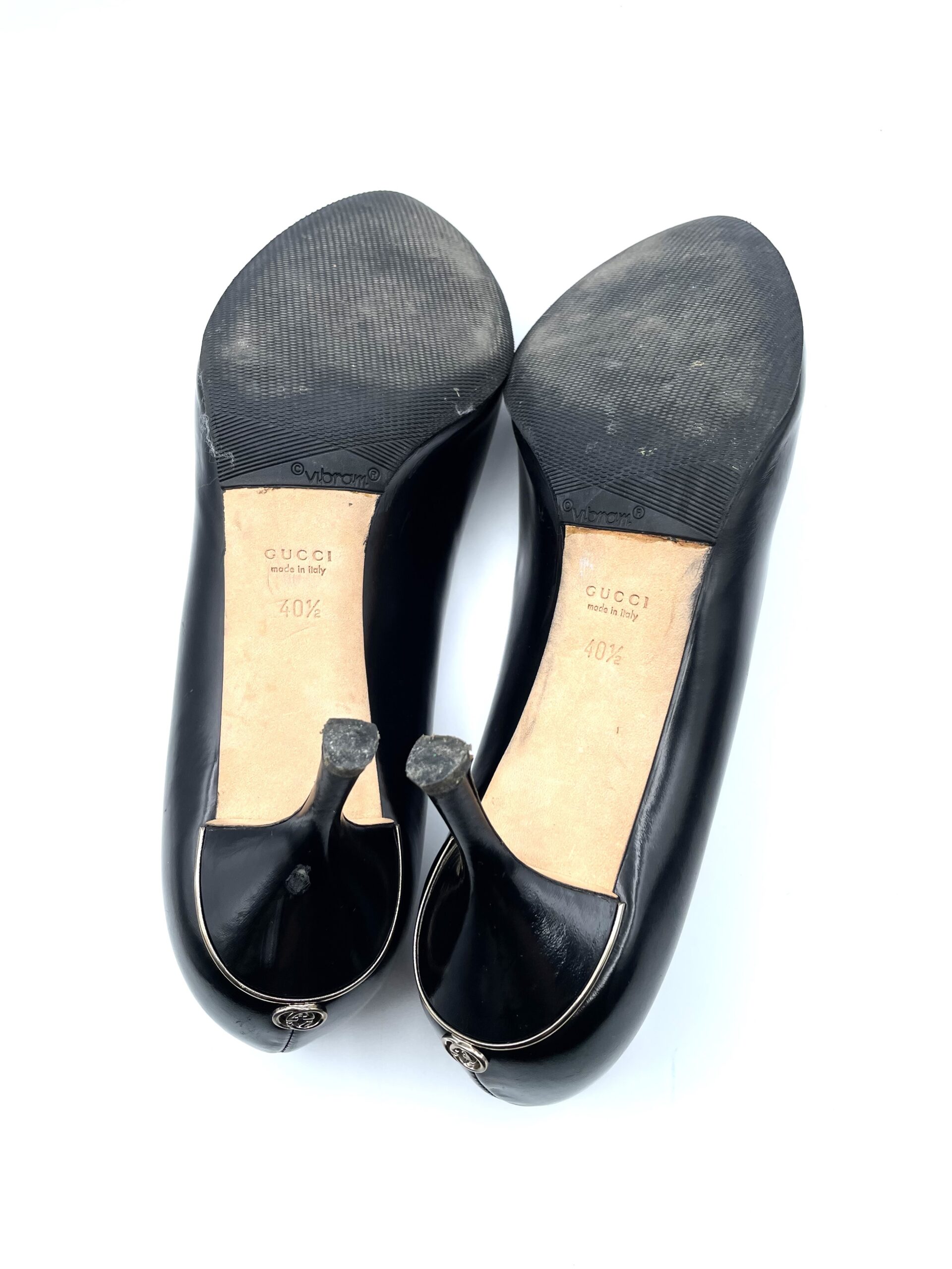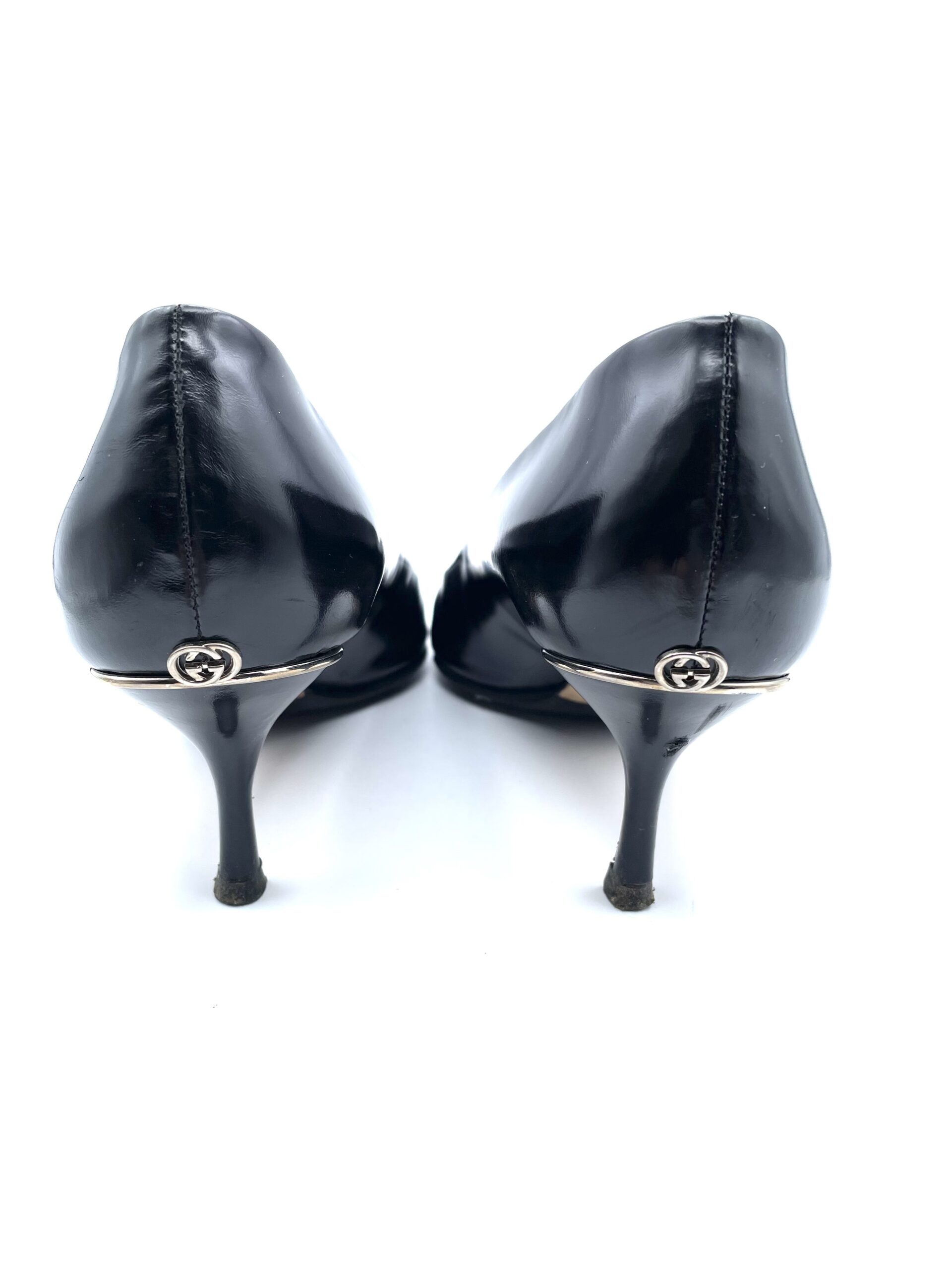 Gucci Leather pumps, 7 cm heeled. Balck color. GG logo and metal finish on the back.