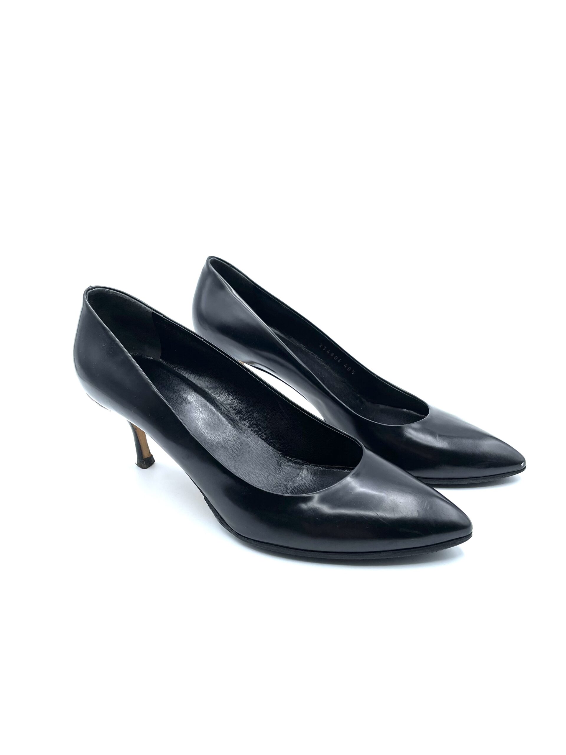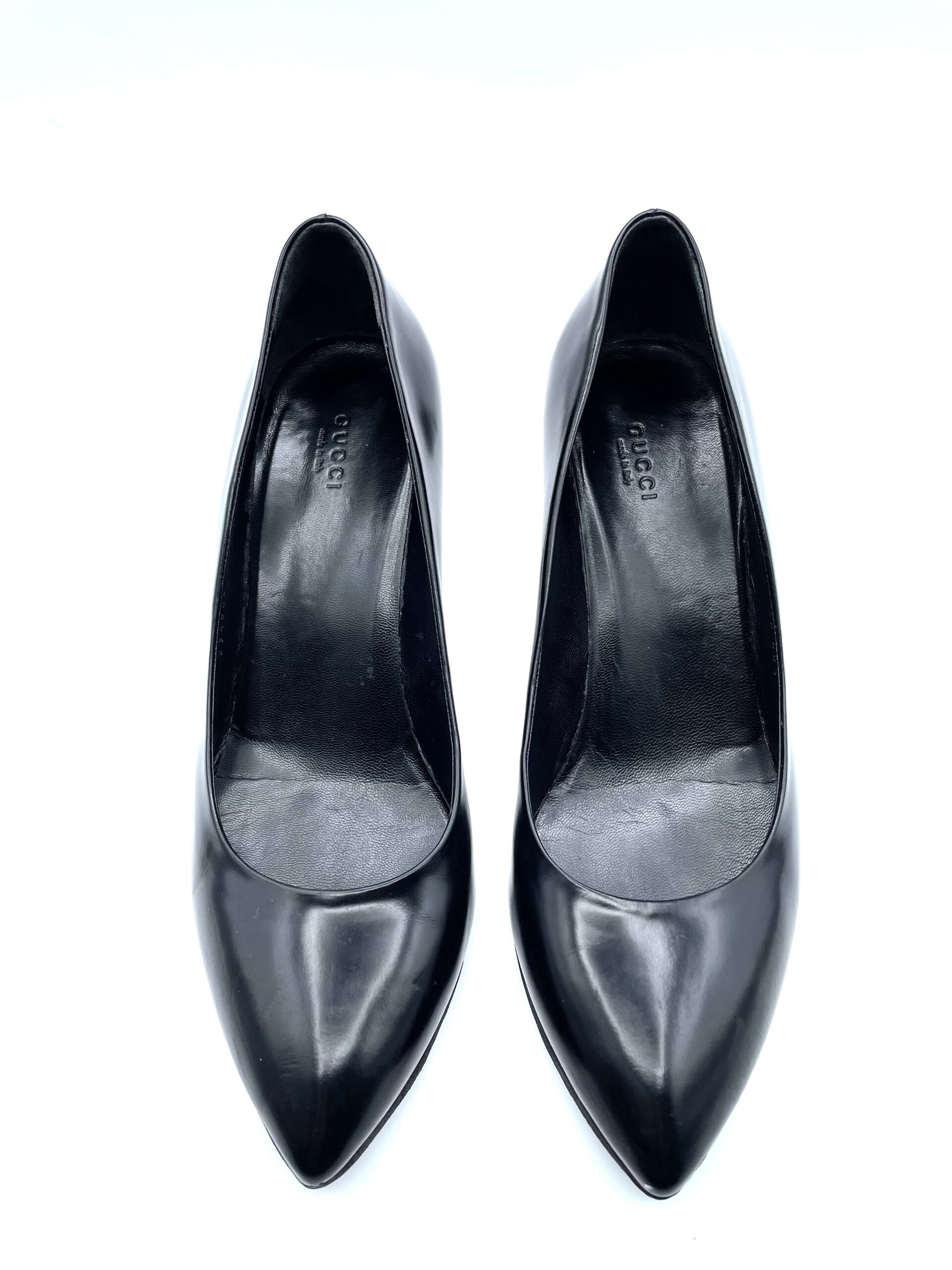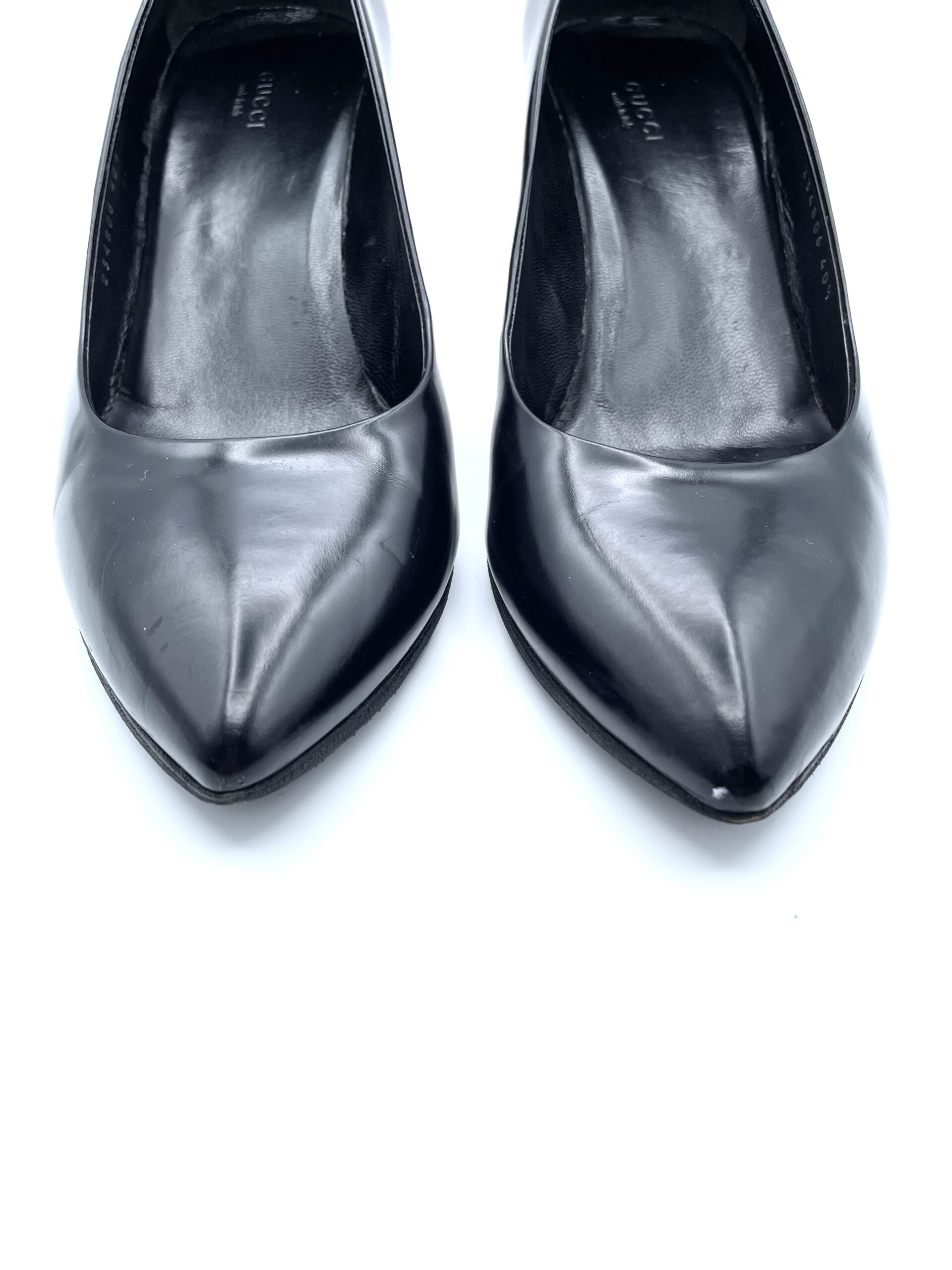 Gucci Leather pumps, 7 cm heeled. Balck color. GG logo and metal finish on the back.